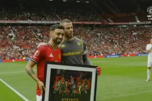 传奇!曼联赛前致敬德赫亚,队长B费向德赫亚赠送纪念相框